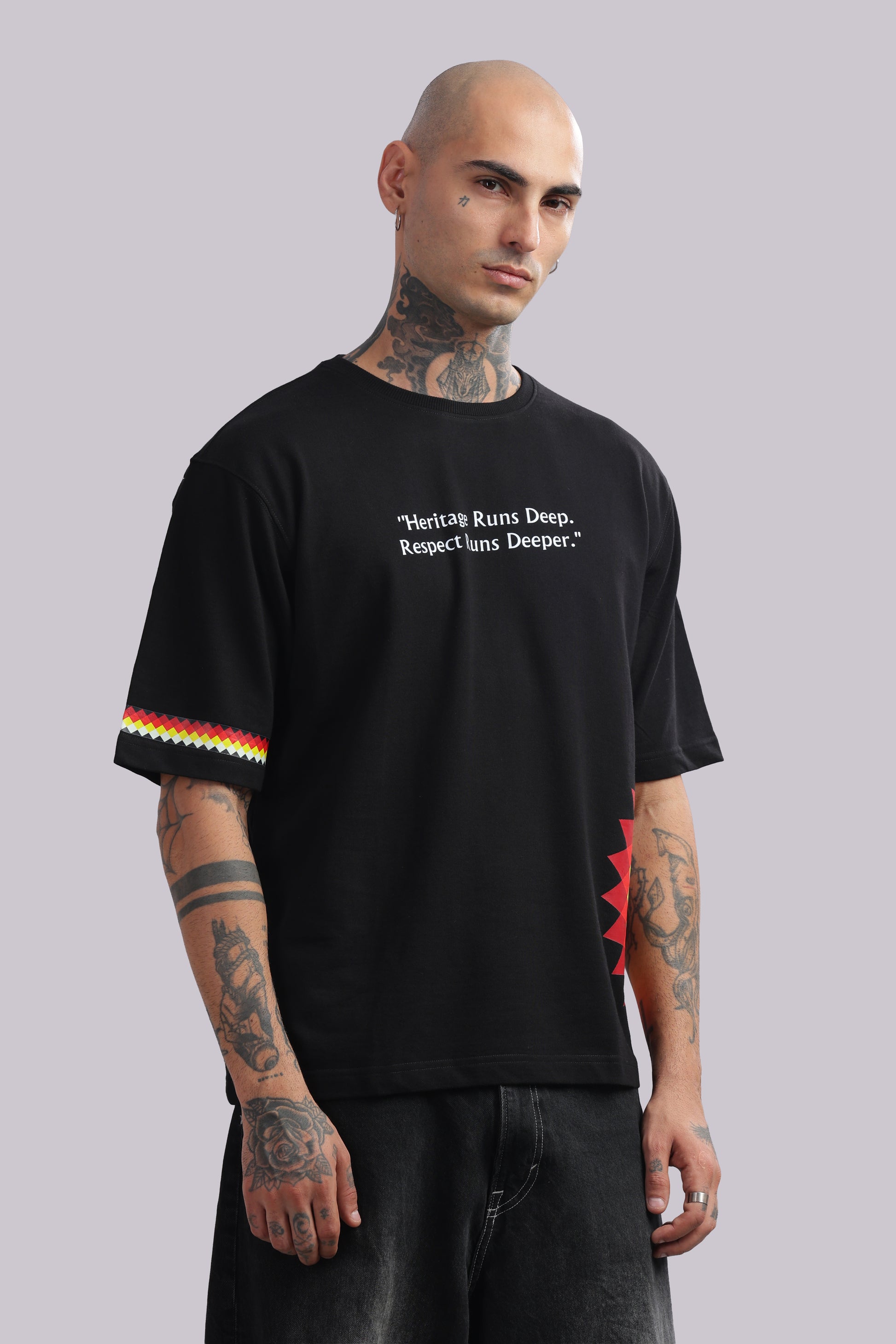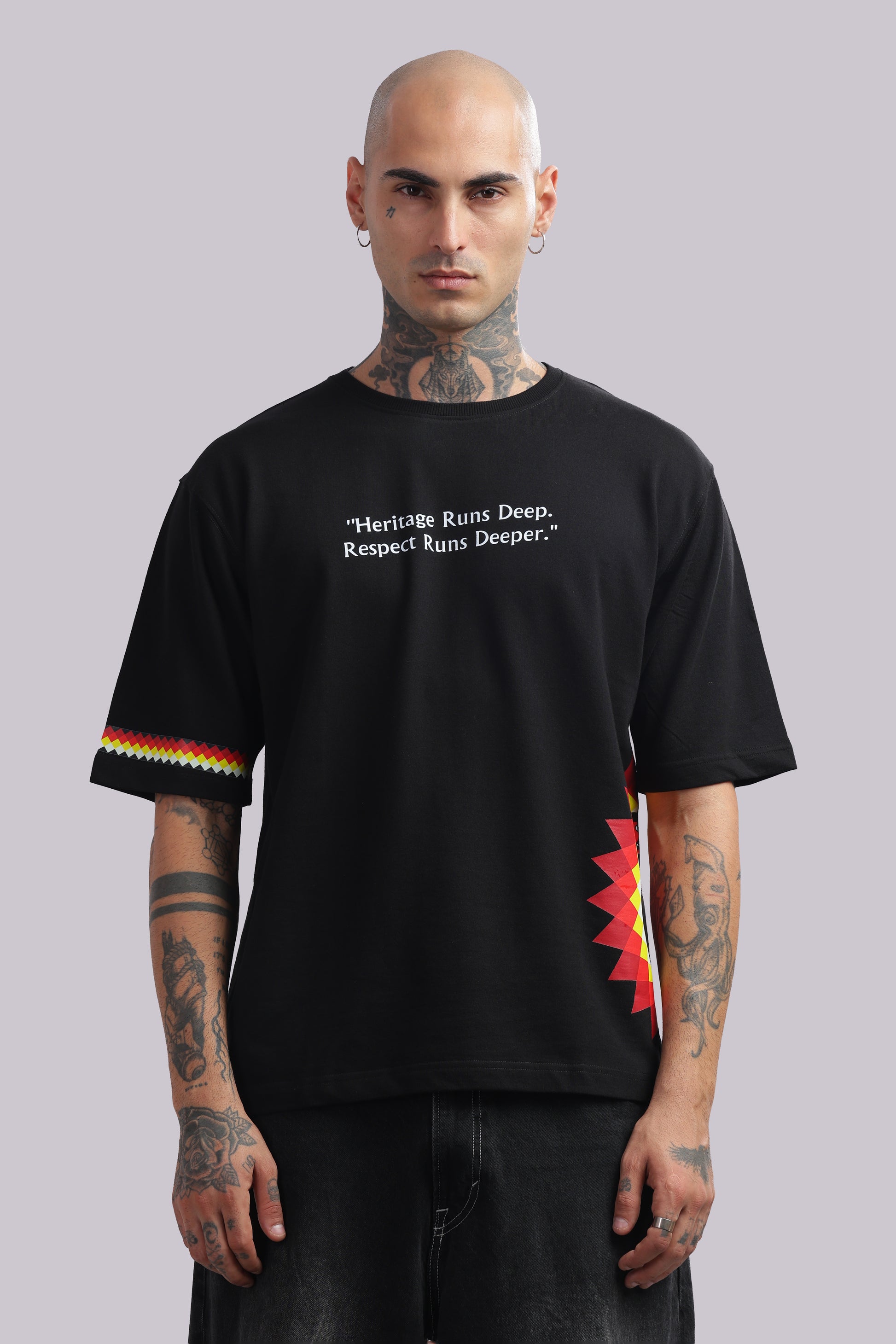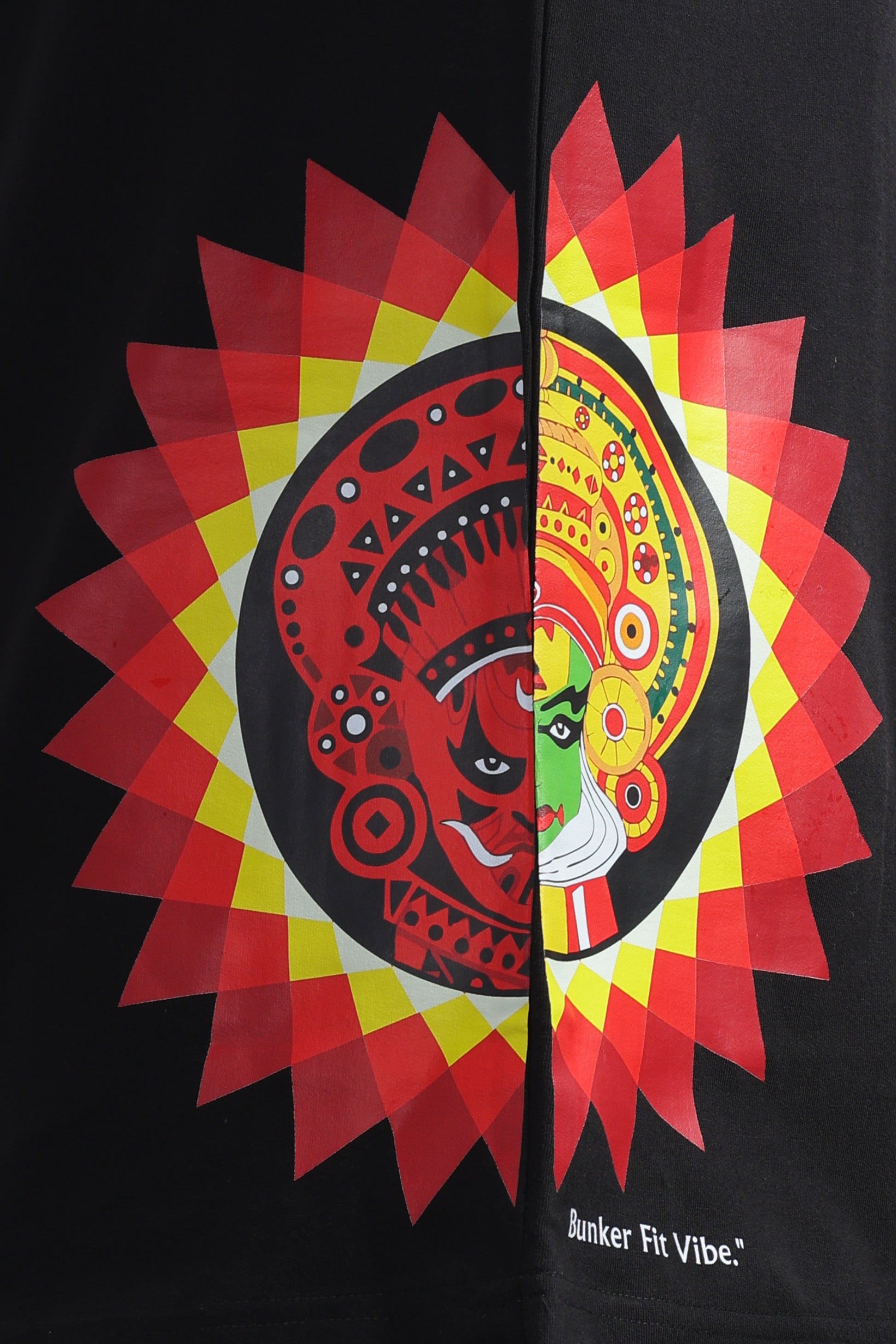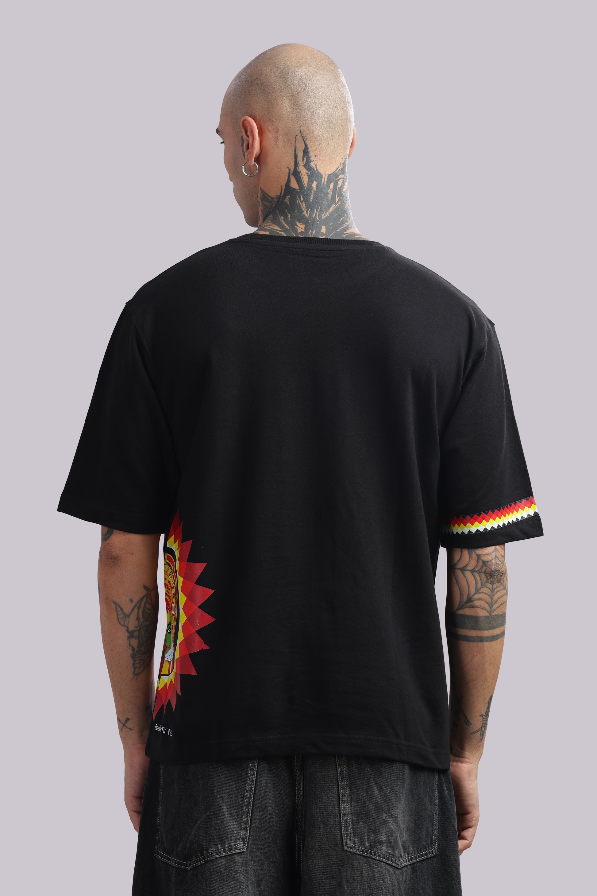Elevate your streetwear game with this edgy black oversized t-shirt, designed for a modern and confident look. Featuring a striking multicolor graphic side print inspired by traditional art forms, this tee combines cultural aesthetics with contemporary fashion. Made from premium-quality fabric, it ensures comfort and breathability, while the relaxed fit adds effortless style. Perfect for casual outings, parties, or layering with streetwear essentials.